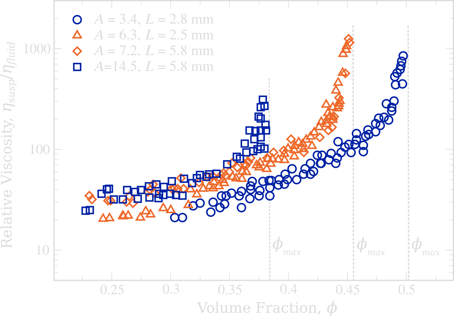 Particles are frequently added to fluids as viscosity modifiers, to create composite materials with enhanced strength and performance, and for many other applications. The viscosity of fluids containing particles is a function of the particle concentration, or volume fraction ϕ, as well as the shape of the particles. As shown above on the right, the shear viscosity can differ significantly for rods of different aspect ratio A. Most particularly, the point at which the viscosity diverges correlates strongly with maximum random packing ϕmax, which is a strong function of the aspect ratio.